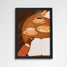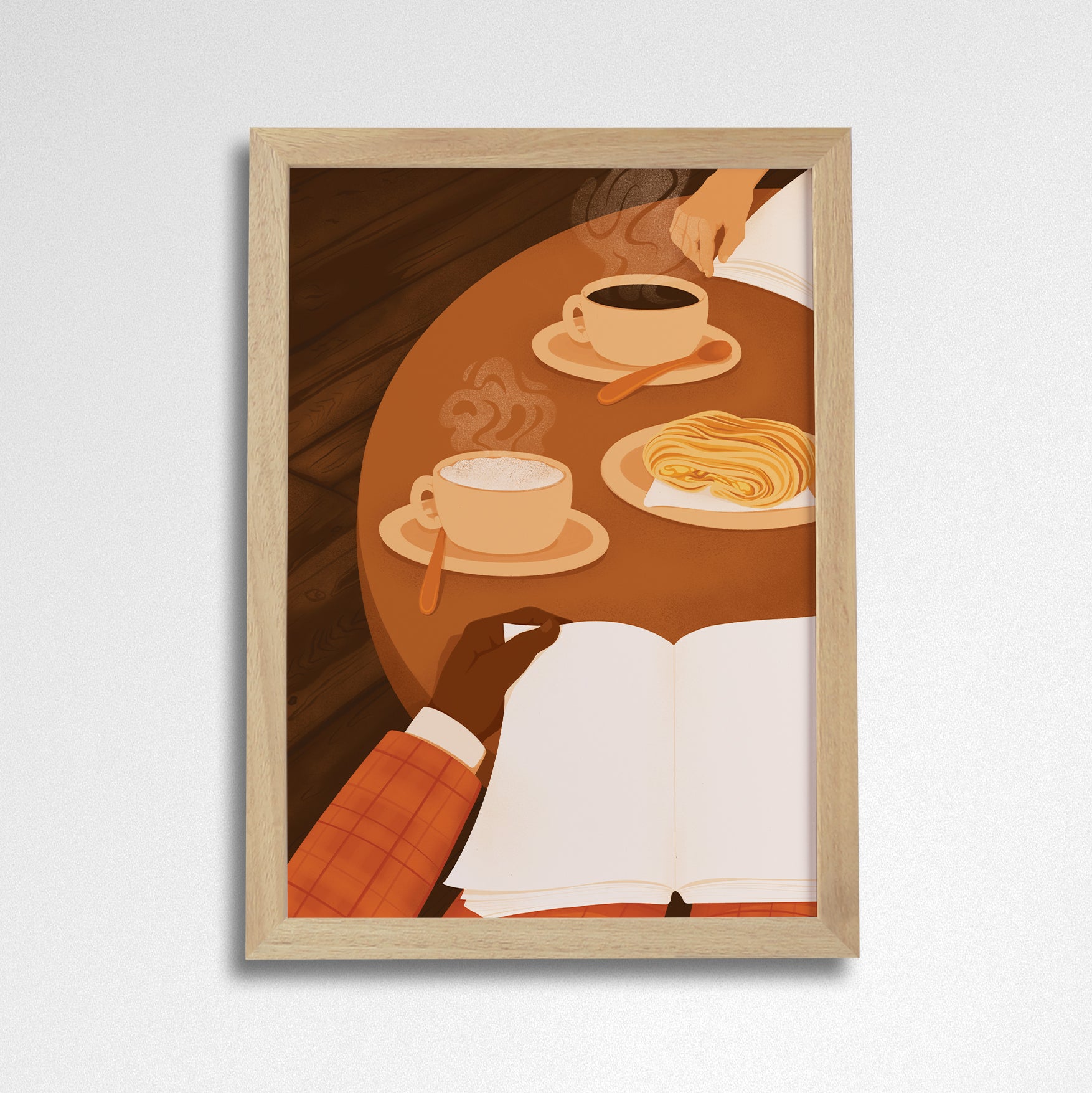 A bookish POV print of someone reading in a cafe with a coffee and pastry. Hand illustrated by our in-house designers with a muted brown colour palette. Perfect for a book lover, bookworm, readers and bibliophiles.
