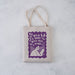 A strong and sturdy tote bag with 'Open a book, open your mind' in a purple scalloped hand-illustrated design.
