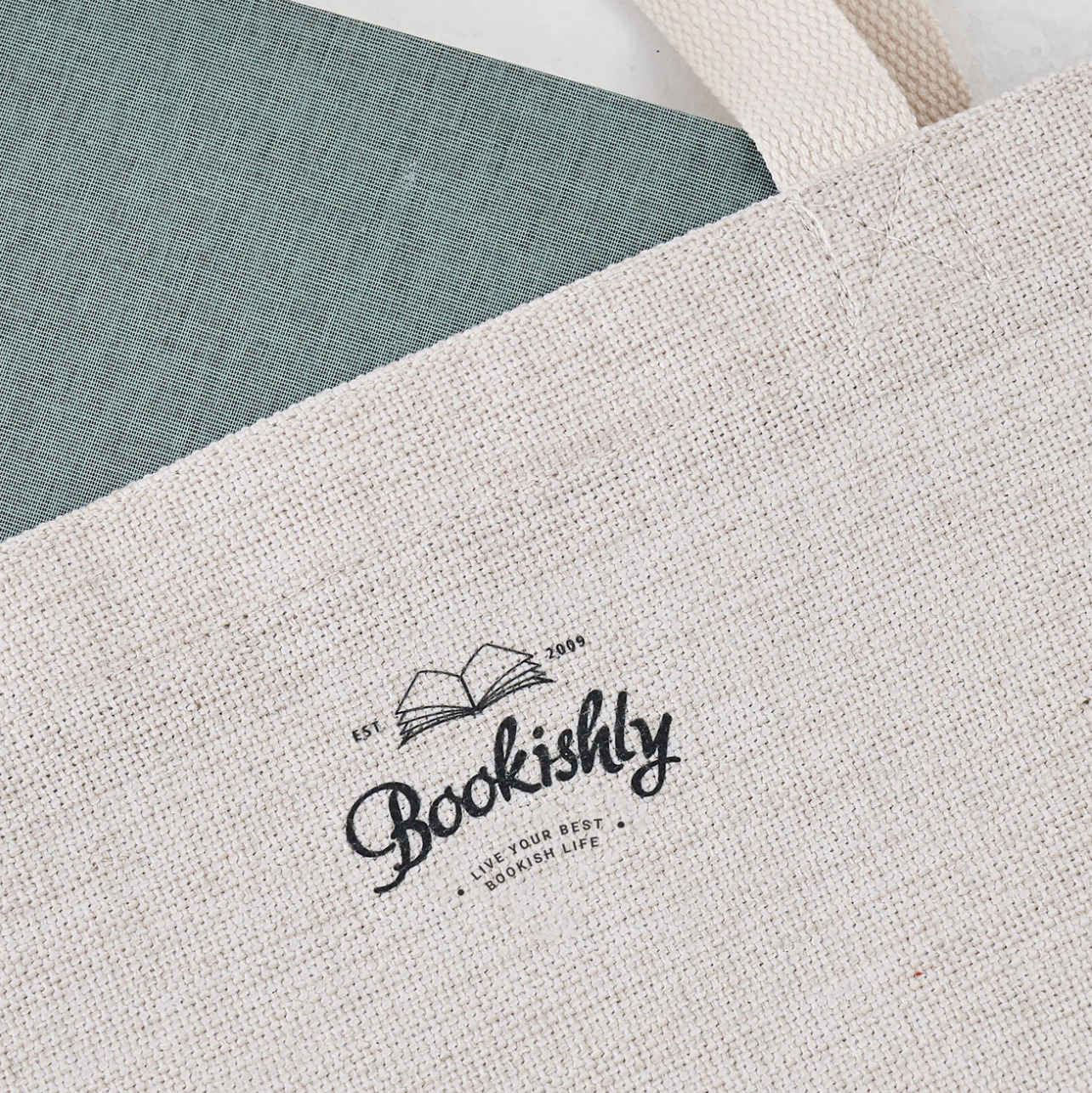 34 cm (W) x 35 cm. (H) | 95% polyester, 5% cotton. Thick and textured with neutral colours and a small Bookishly logo on the reverse. The strap hangs 25 cm from its highest point.