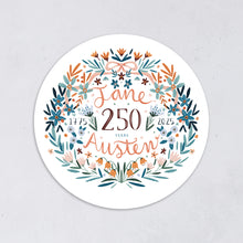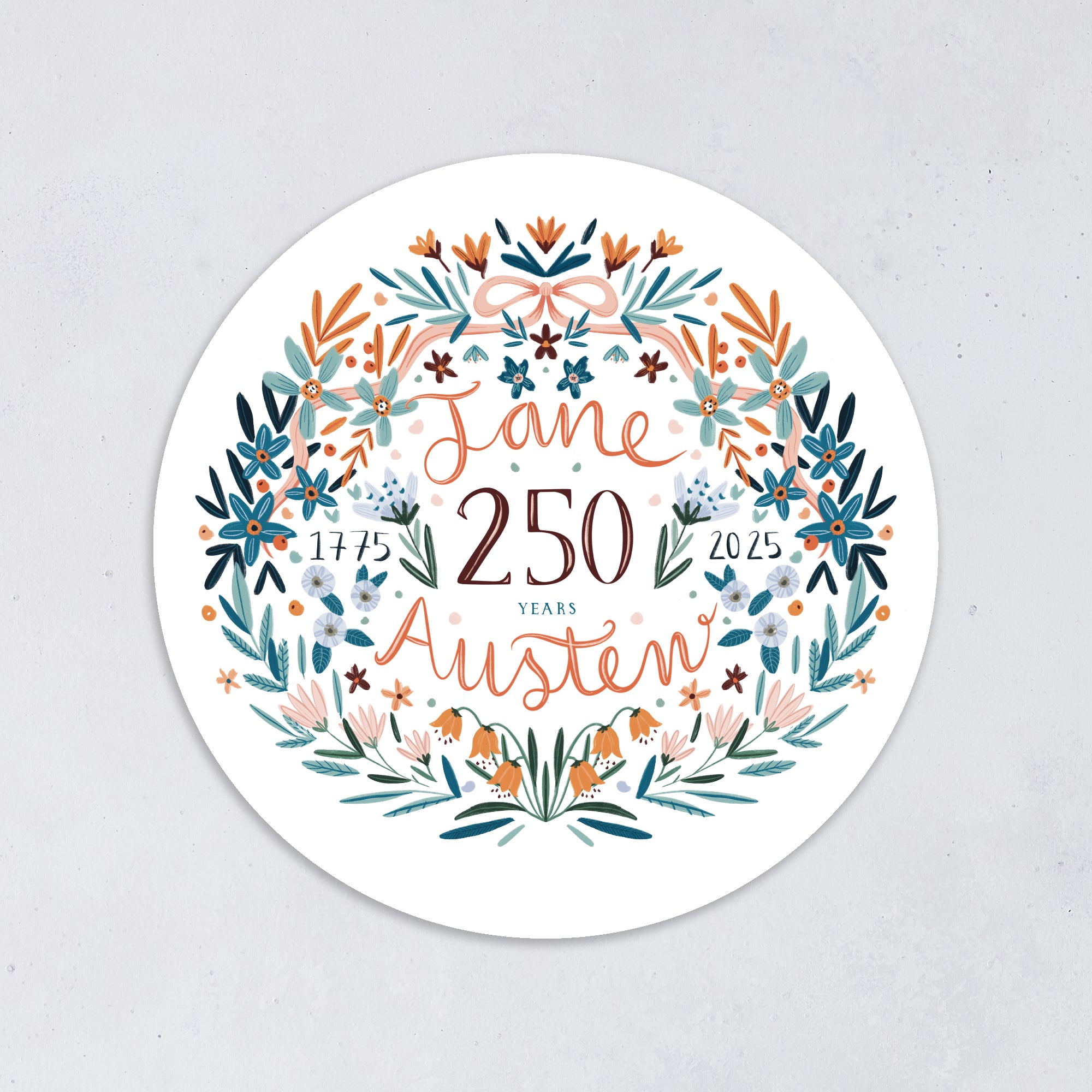 A large die cut vinyl sticker featuring Jane Austen's 250th Anniversary.