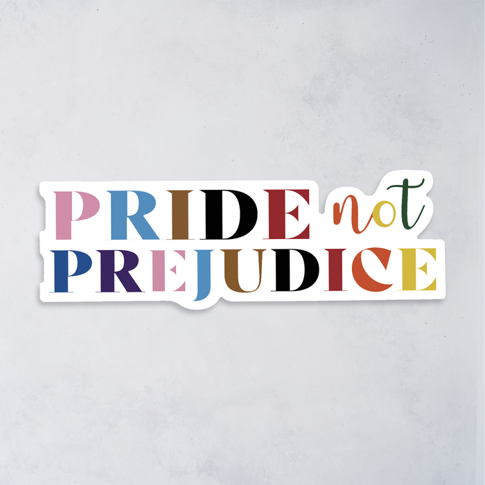 A large die cut vinyl sticker in rainbow pride colours with the slogan 'Pride not Prejudice'. When your love for Jane Austen and the LGBTQIA+ community overlap! Bookish stationery for your laptop, phone, e-reader, notebook or simply anywhere. Same great designs but bolder, brighter and higher quality!