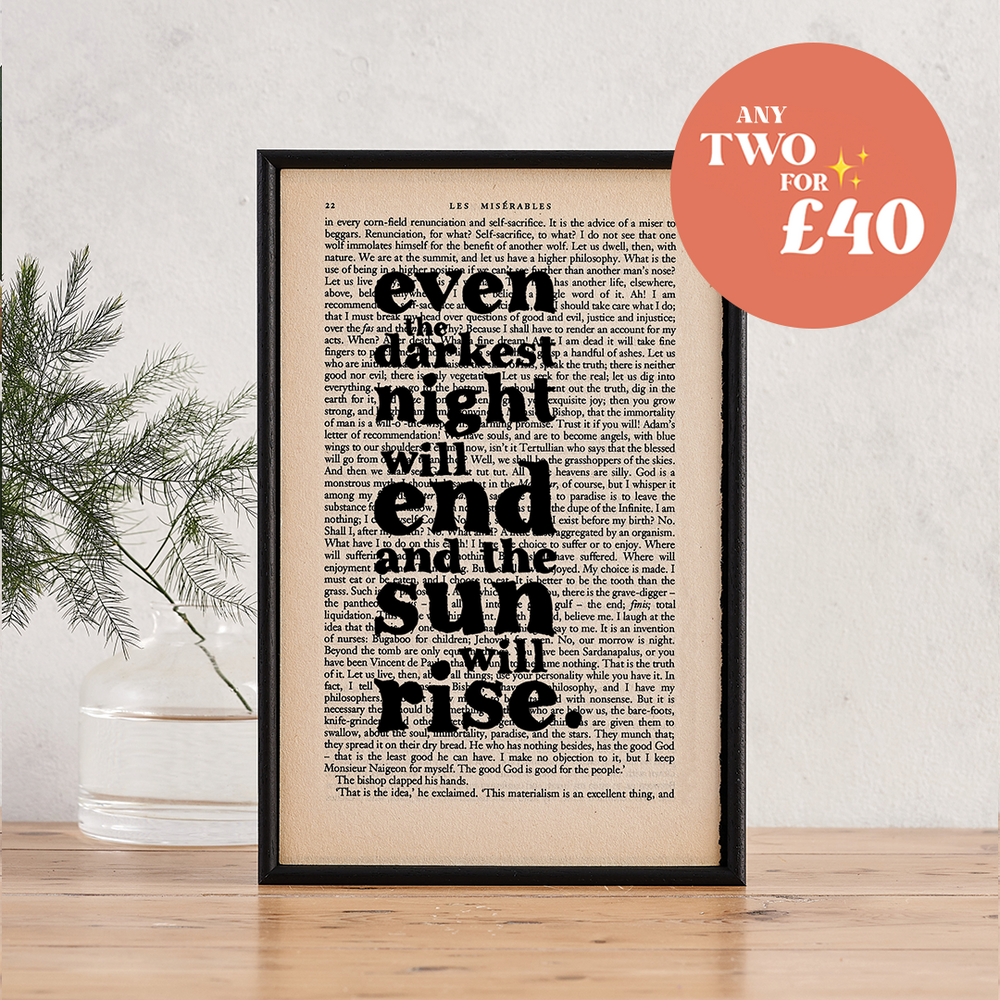 A wonderful present to cheer up a friend! This book page print features a beautiful quote from Victor Hugo's Les Misérables - a great gift idea. Perfect for book lovers, bookworms, bibliophiles and readers.