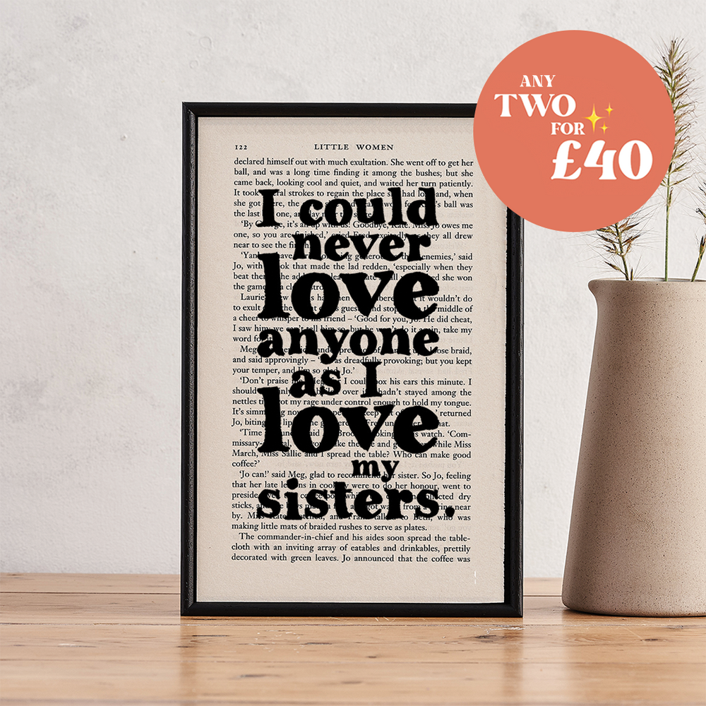 We know not everybody has more than one sister, we’ve given you the option to choose the ‘sister’ quote too! The Little Women gift features our exclusive handwritten font and is printed over a unique page from the book itself.