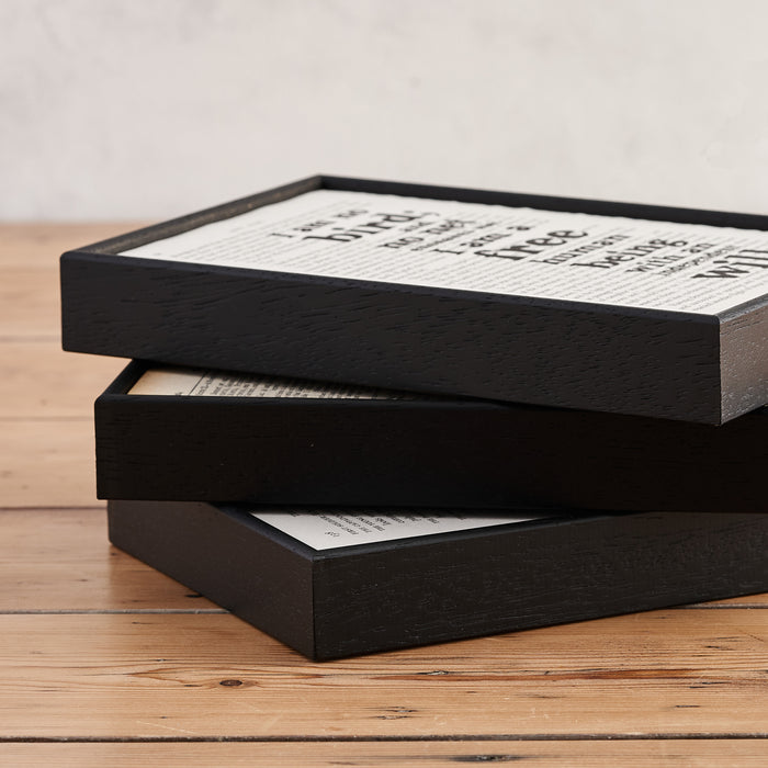 Frames are handmade in-house at our studio here in Northamptonshire, UK. We use wood sourced from sustainably managed forests. Frames hang neat to the wall or can stand freely by themselves - they look great on a bookshelf! There's no glass used so you're able to feel the lovely book page.