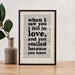 Framed book page print featuring the quote “When I saw you I fell in love, and you smiled because you knew” printed in bold black type on a vintage-style book page.