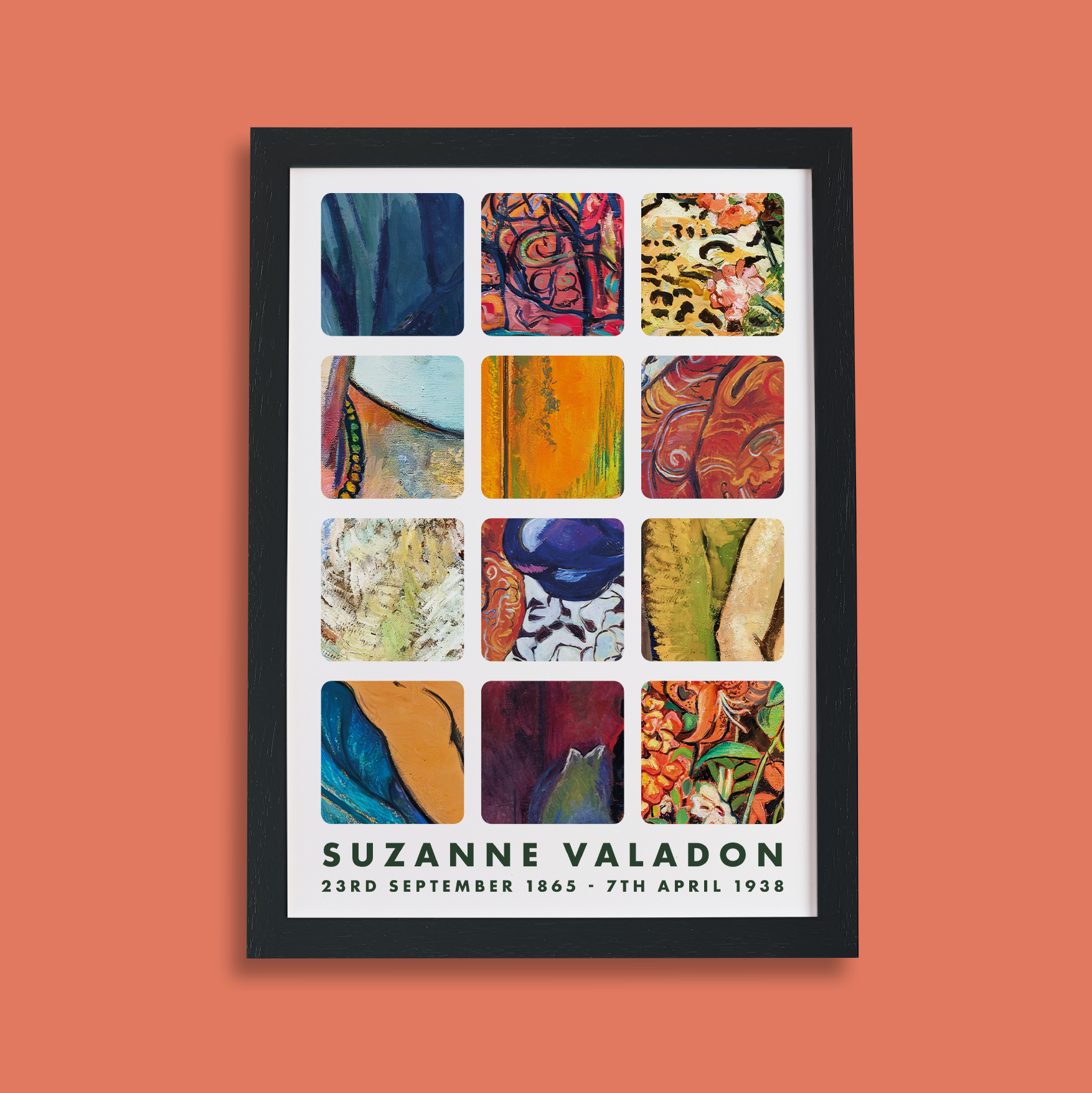 Add instant impact to your walls with this bold art print inspired by Suzanne Valadon. Featuring twelve abstract tiles taken from her vivid, energetic paintings, the design captures the strong lines, layered brushwork, and rich colour that defined her distinctive style. Ideal for lovers of expressive art, fearless interiors, and post-impressionist flair, it’s a powerful piece that brings both colour and character to your space.