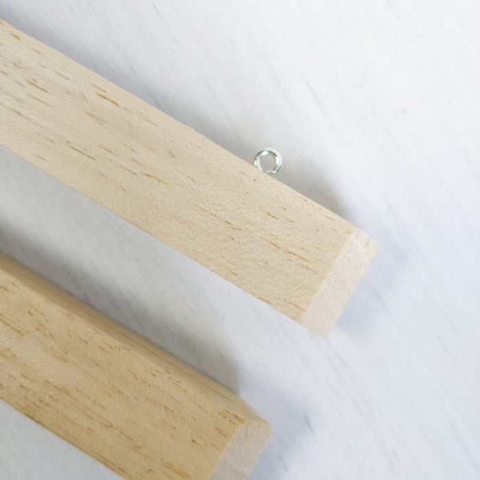 A single magnetic wooden poster frame and hanger for art prints made from solid natural uncoated wood (obeche) and white string, small silver loops and strong magnetic tape, giving them a sleek Scandinavian design. This magnetic hanger frame holds our prints firmly without damaging them.